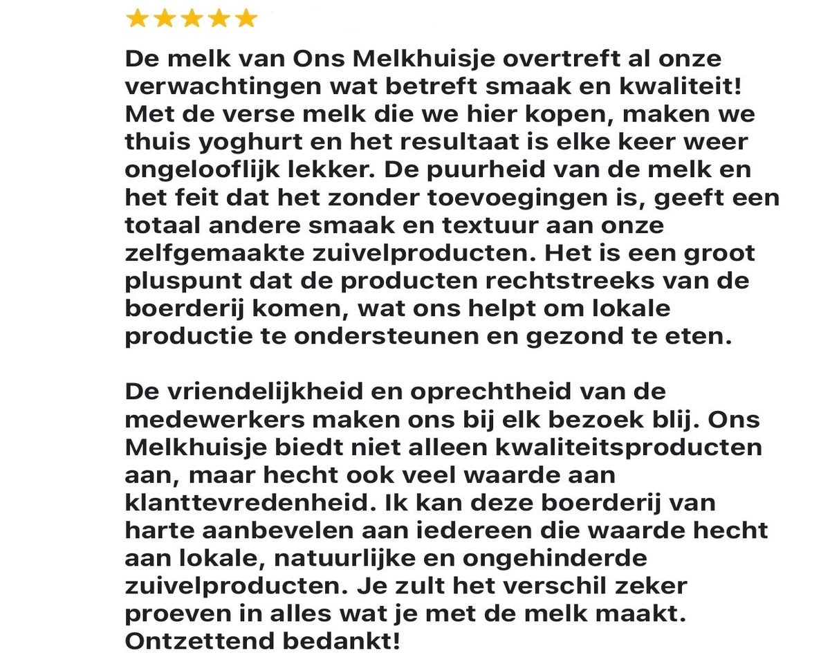 Op onze boerderij produceren wij samen met onze koeien en de natuur (h)eerlijke melk. Iedere dag werken wij met liefde en passie om een natuurlijk product te creëren dat een gezonde en voedzame toevoeging is op de voedingsbehoefte van de mens. Dit betekent voor ons dat wij een product willen creëren dat puur is, door er zo min mogelijk aan te doen. Dus geen extra toevoegingen of aanpassingen, zodat datgene wat het product juist zo voedzaam maakt niet verloren gaat.